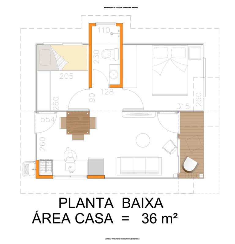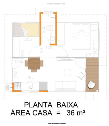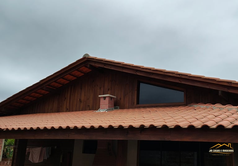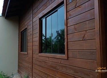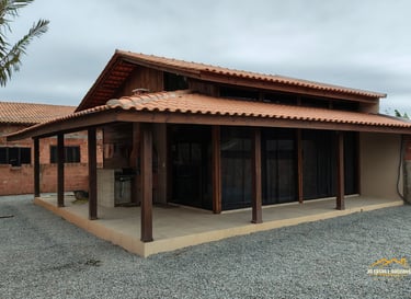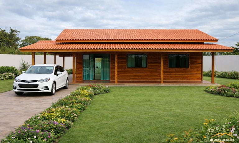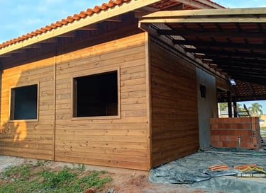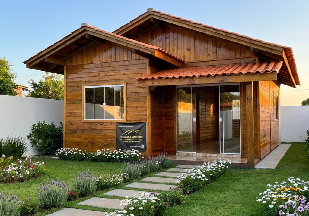 Kit Casa em Pinus com 36m², incluindo toda estrutura em madeira e telhas portuguesas. Não está incluso materiais de acabamento e montagem.